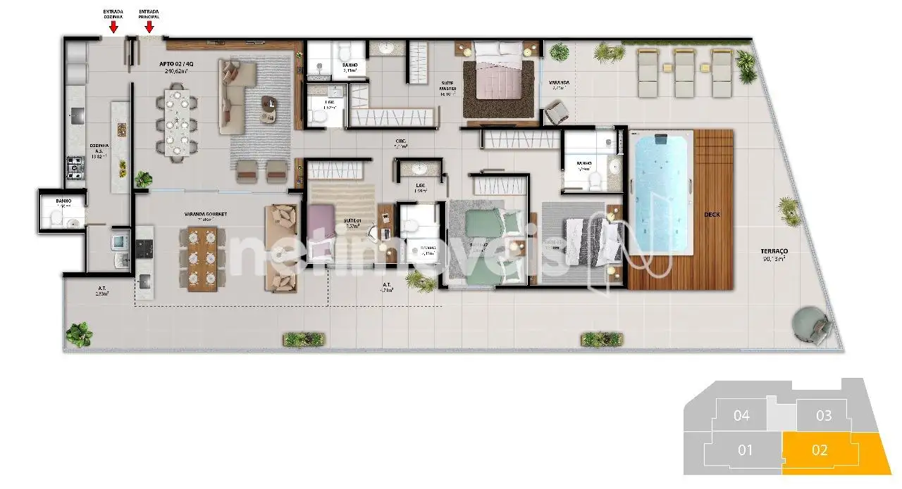 Apartamentos de 03 e 04 suítes, entre 96,77m2 à 240,62m2 (GARDEN) de área "privativa", com 02 à 04 vagas de garagem. Ideais para famílias curtirem seus momentos de lazer ou para investidores que optam por locações de alto padrão.